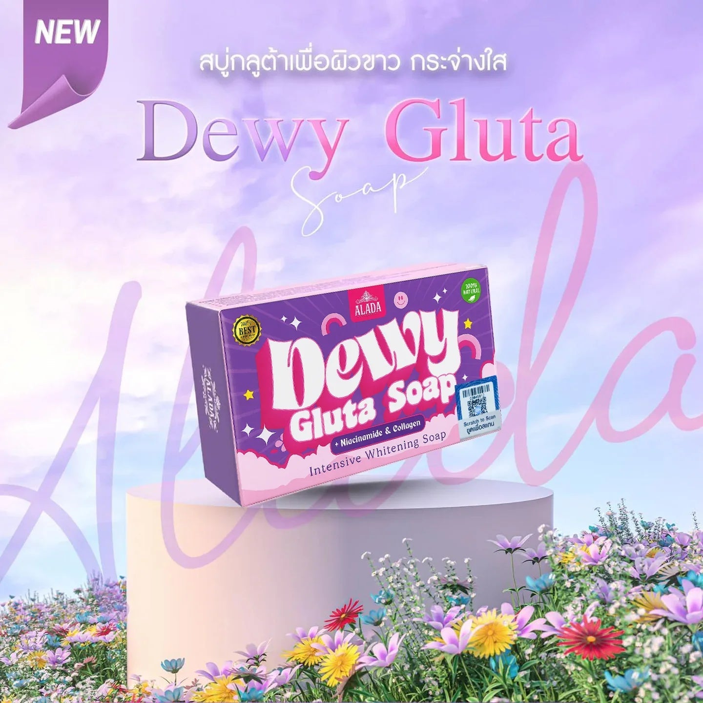 Alada Dewy Gluta Soap is a premium Thai whitening bar formulated to brighten, hydrate, and rejuvenate the skin. Enriched with Glutathione, Niacinamide, and Collagen, it targets dark spots, uneven skin tone, and early signs of aging to promote a radiant, youthful glow.