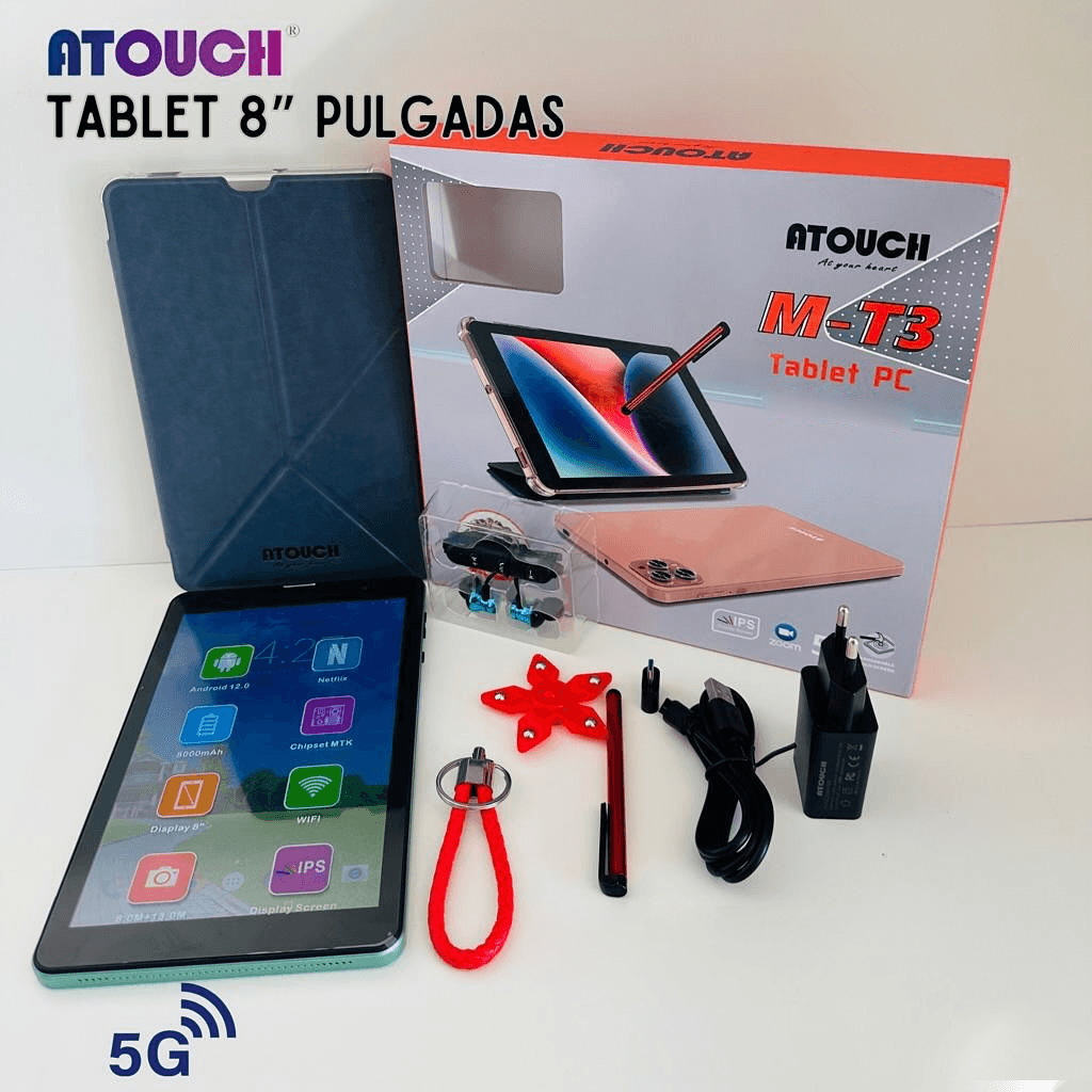 The Atouch M-T3 tablet has a 13 MP rear camera, allowing you to capture images and record videos. The front camera is 8 MP, ideal for video calls or selfies. The battery is 8000 mAh, offering long autonomy so you can enjoy your tablet without worrying about the charger.