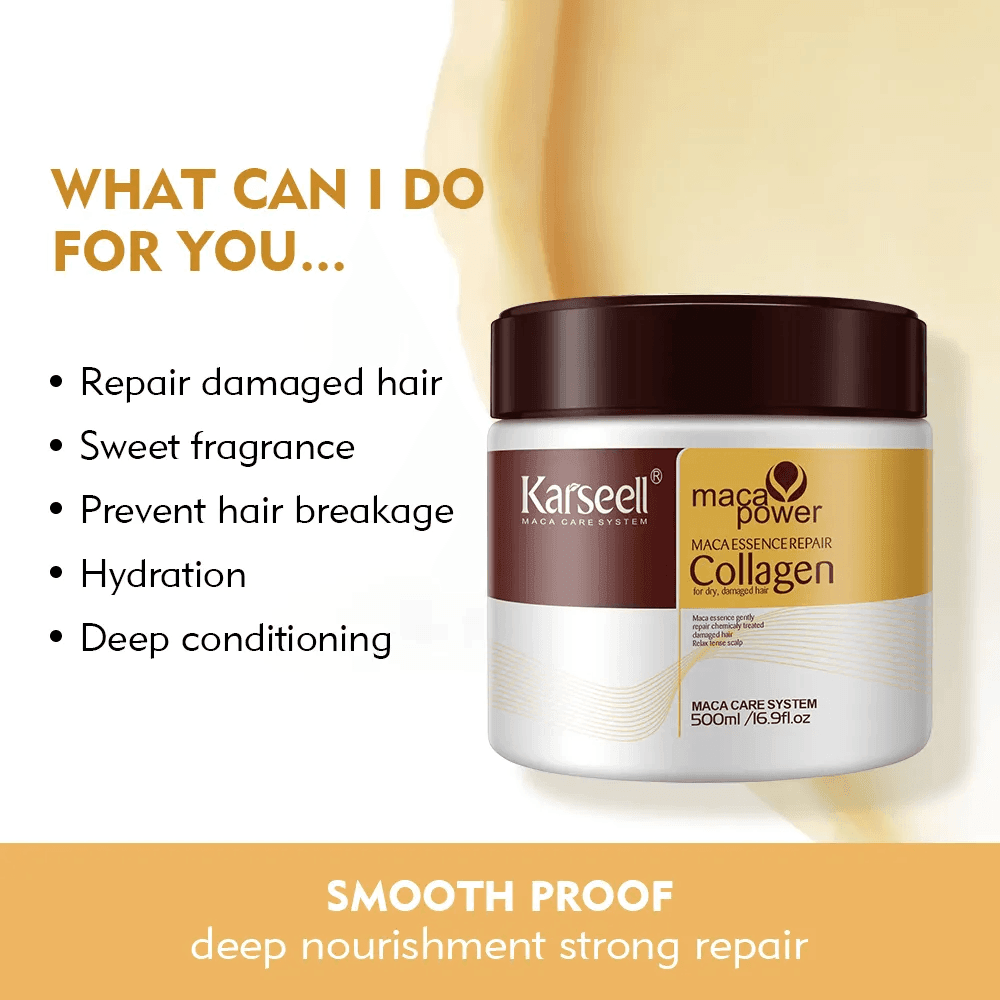 Repair power maca essenceKarseell collagen hair mask contains rare maca essence which are integraled with Karseell active collagen evaporating and penetrating lechnology. It can deliver magic activating energy to damaged hair from tools to ends, repair hair fibers and fill in the hair cavities, leaving hair hydrated, orderly, smooth and luster. |