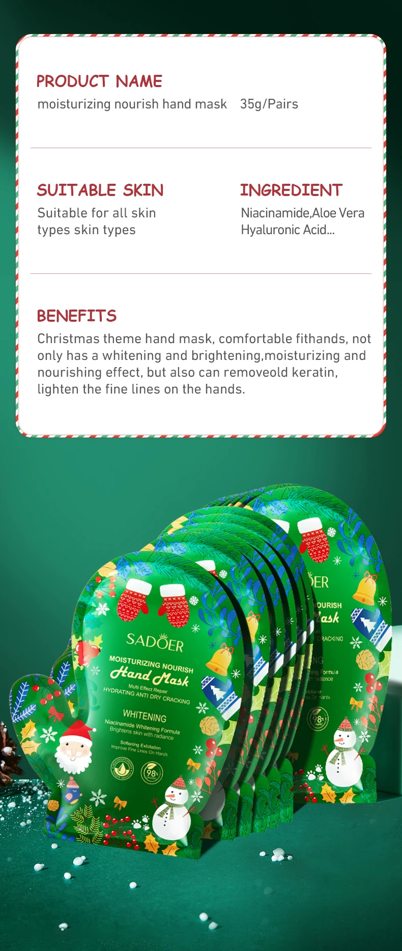 Give your hands and feet the ultimate festive pampering with our Holiday Self-Care Duo. This set includes a Niacinamide Exfoliating Foot Mask and the Sadoer Merry Christmas Rejuvenating Hand Mask, designed to deliver spa-like results from the comfort of your home. Together, they exfoliate, hydrate, nourish, and restore your skin—making them an ideal holiday gift or winter self-care treat.