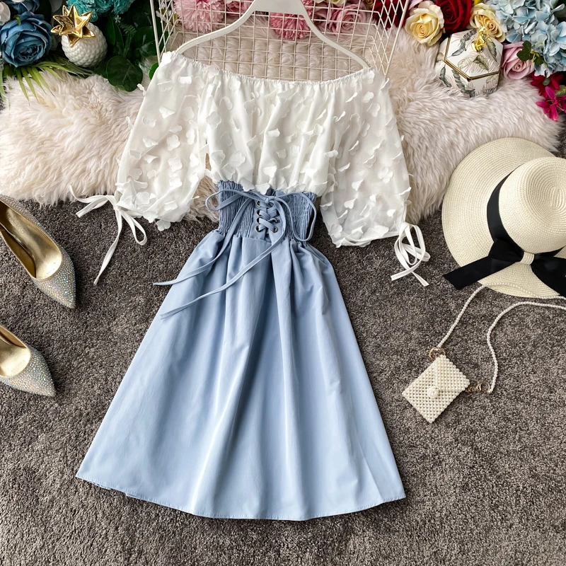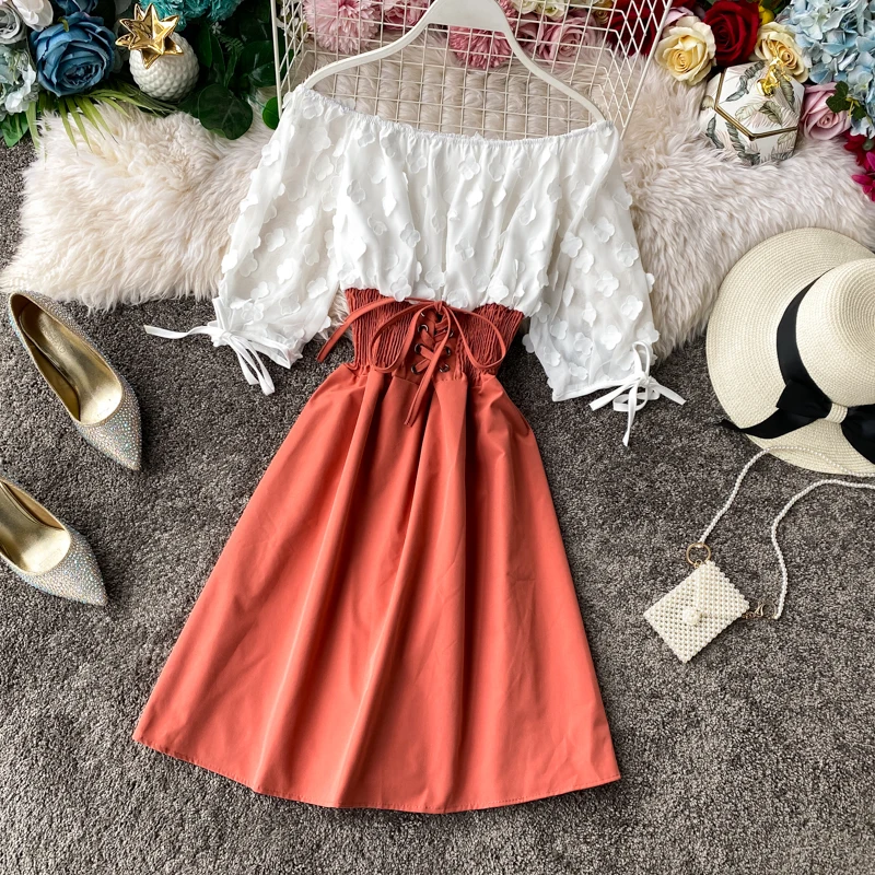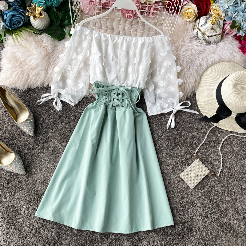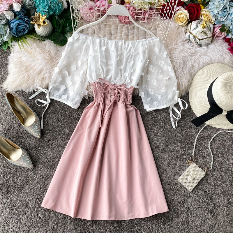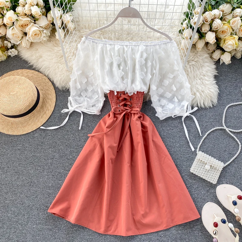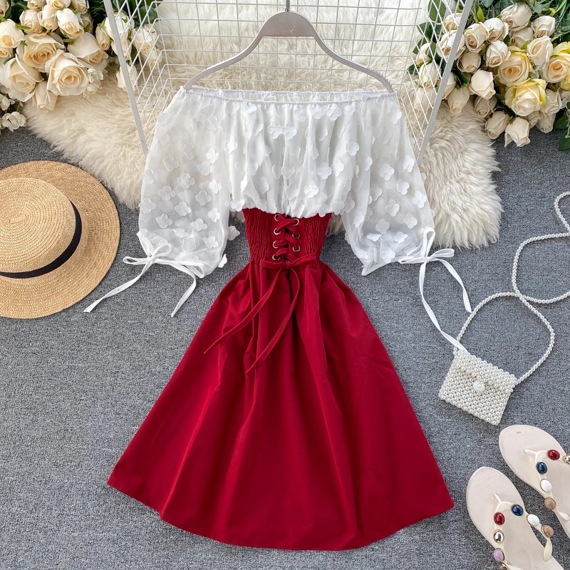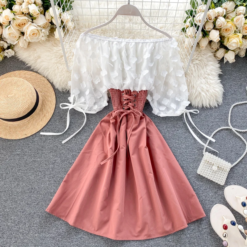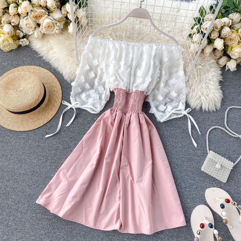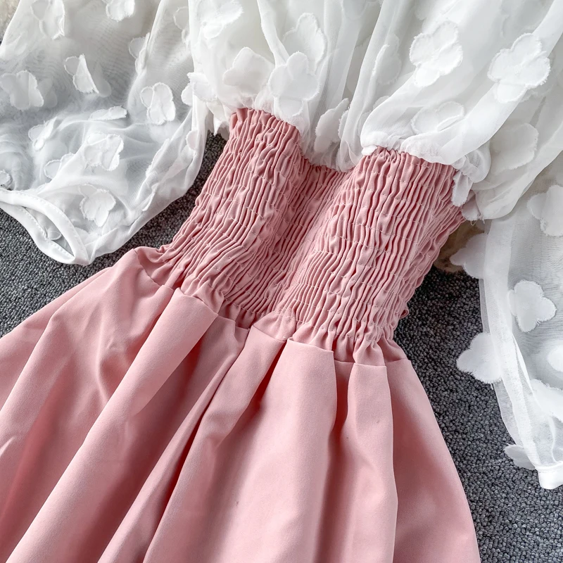 Slash Neck Solid Chiffon Puff Sleeve Flower Party Dress