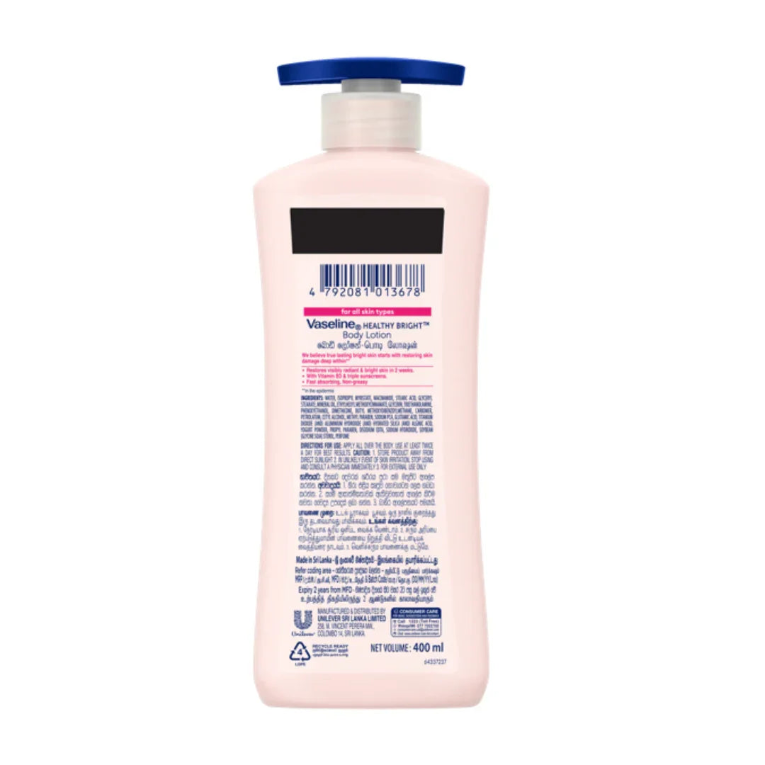 Healthy, Glowing Skin Starts Here. Vaseline Healthy Bright Body Lotion is a nourishing, deeply moisturizing formula designed to keep your skin soft, smooth, and radiant all day long. Enriched with Vitamin B3, triple sunscreens, and micro-droplets of Vaseline Jelly, it helps protect, repair, and brighten your skin from within.
