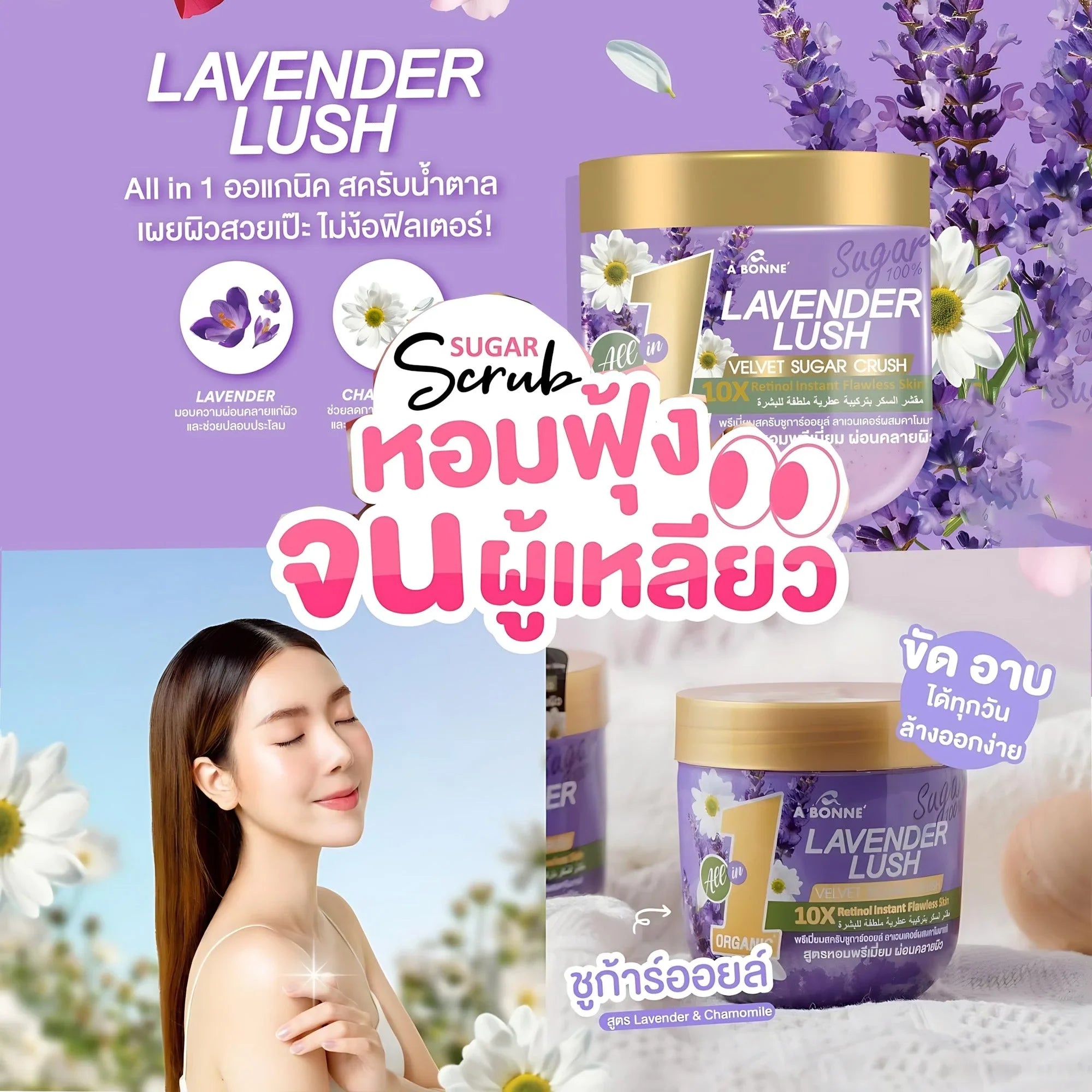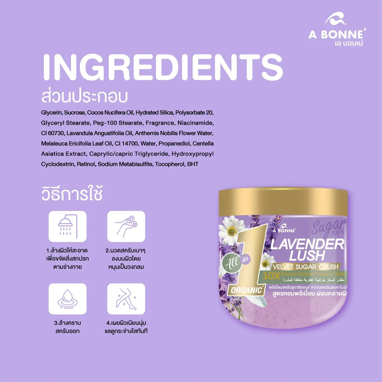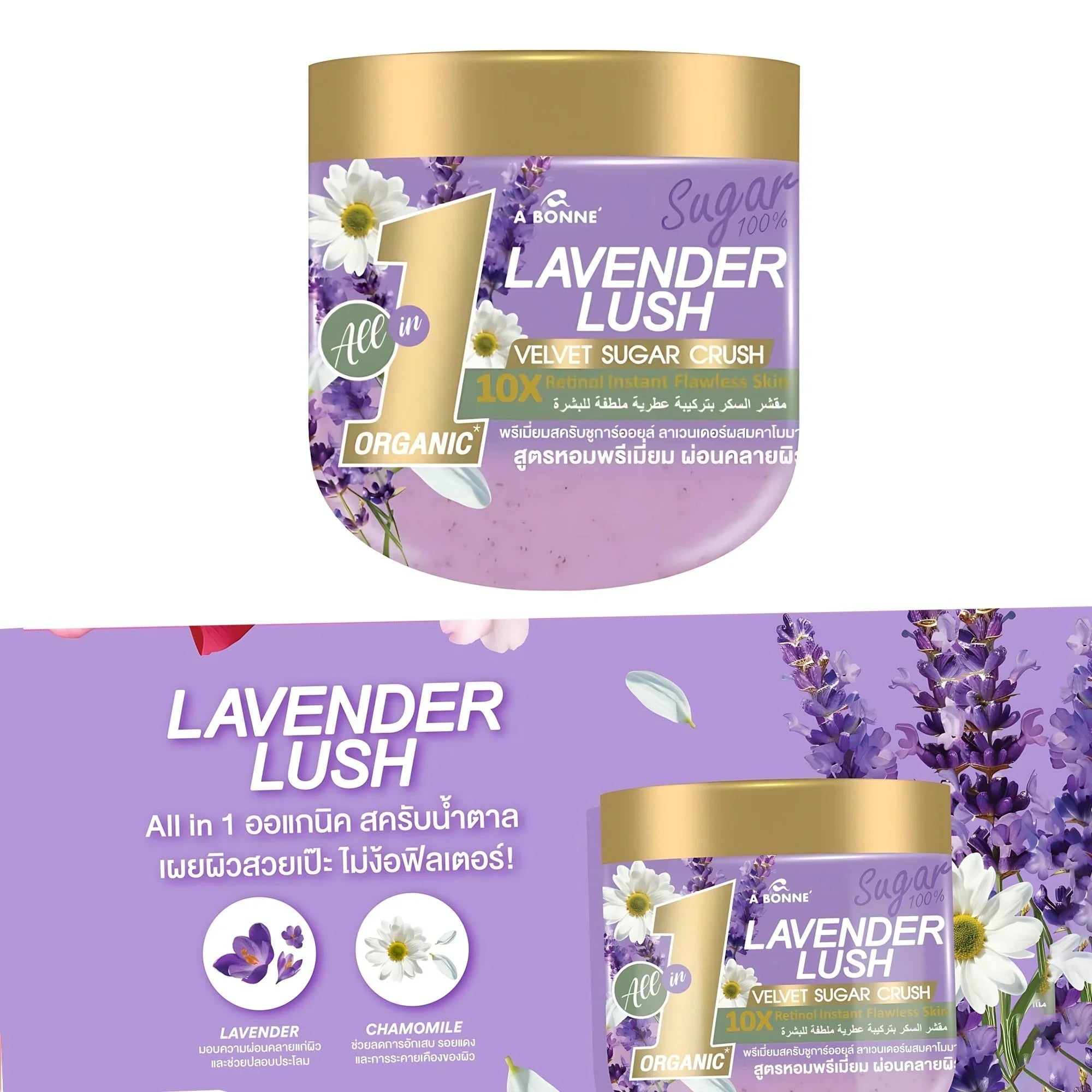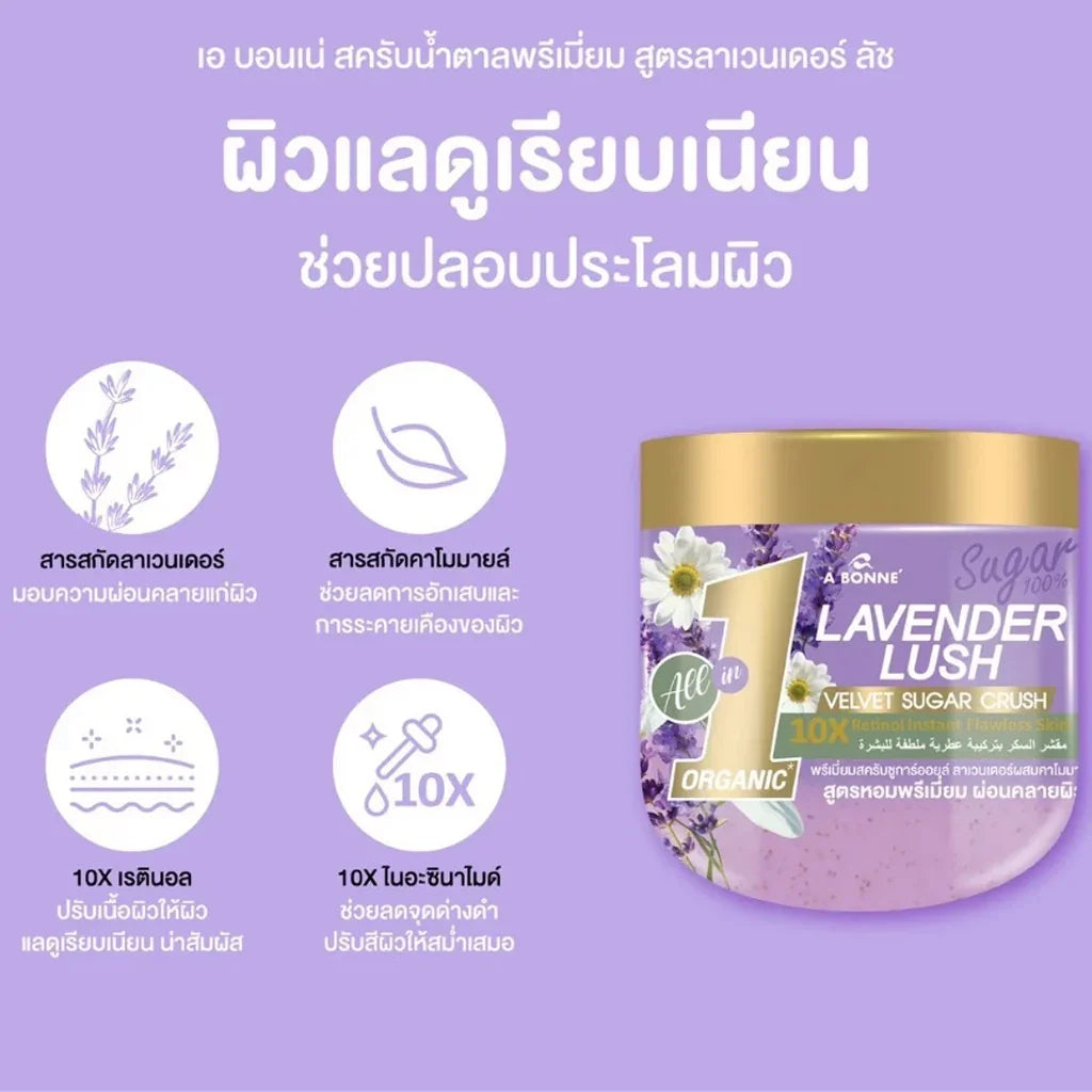 Say goodbye to dry, rough skin with A Bonne Lavender Lush Velvet Sugar Crush Scrub. This premium sugar scrub with oil is made from 100% natural sugar to gently exfoliate dead skin cells and remove impurities caused by pollution. Its nourishing formula leaves skin feeling smooth, relaxed, and healthy-looking after every use.