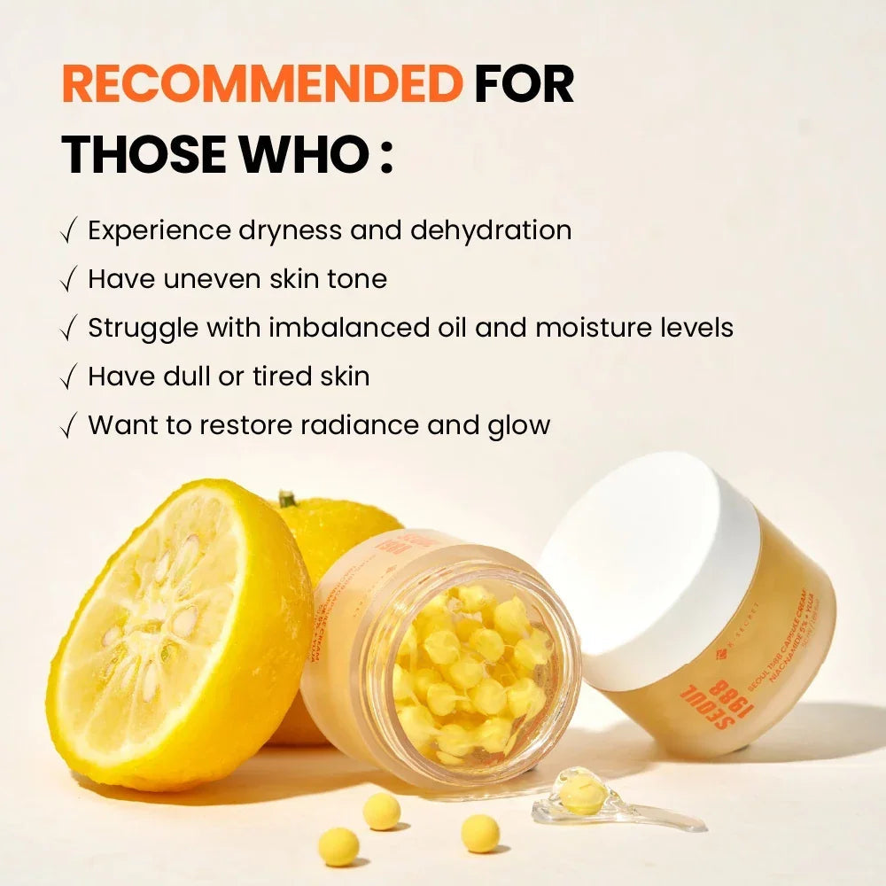 Achieve even, radiant, and well-hydrated skin with K-SECRET – SEOUL 1988 Capsule Cream, a lightweight yet effective dual-texture cream developed to revitalize dull, tired, and uneven skin. Powered by 5% Niacinamide, Yuja (Yuzu) extract, and innovative capsule technology, this cream delivers targeted brightening, hydration, and barrier care without heaviness.