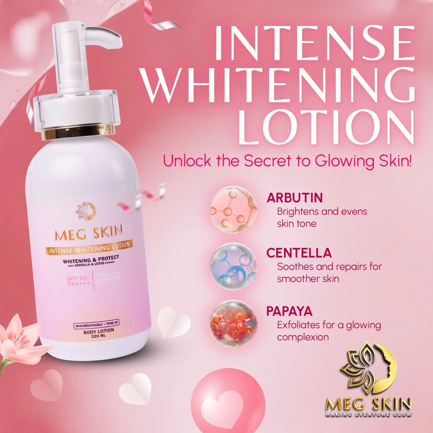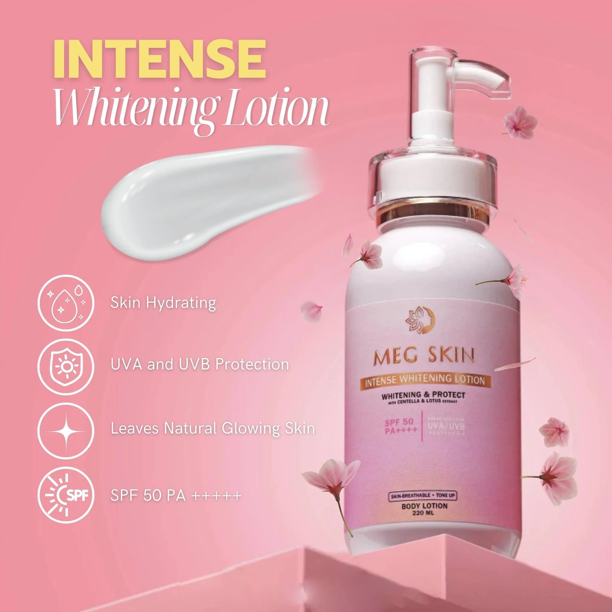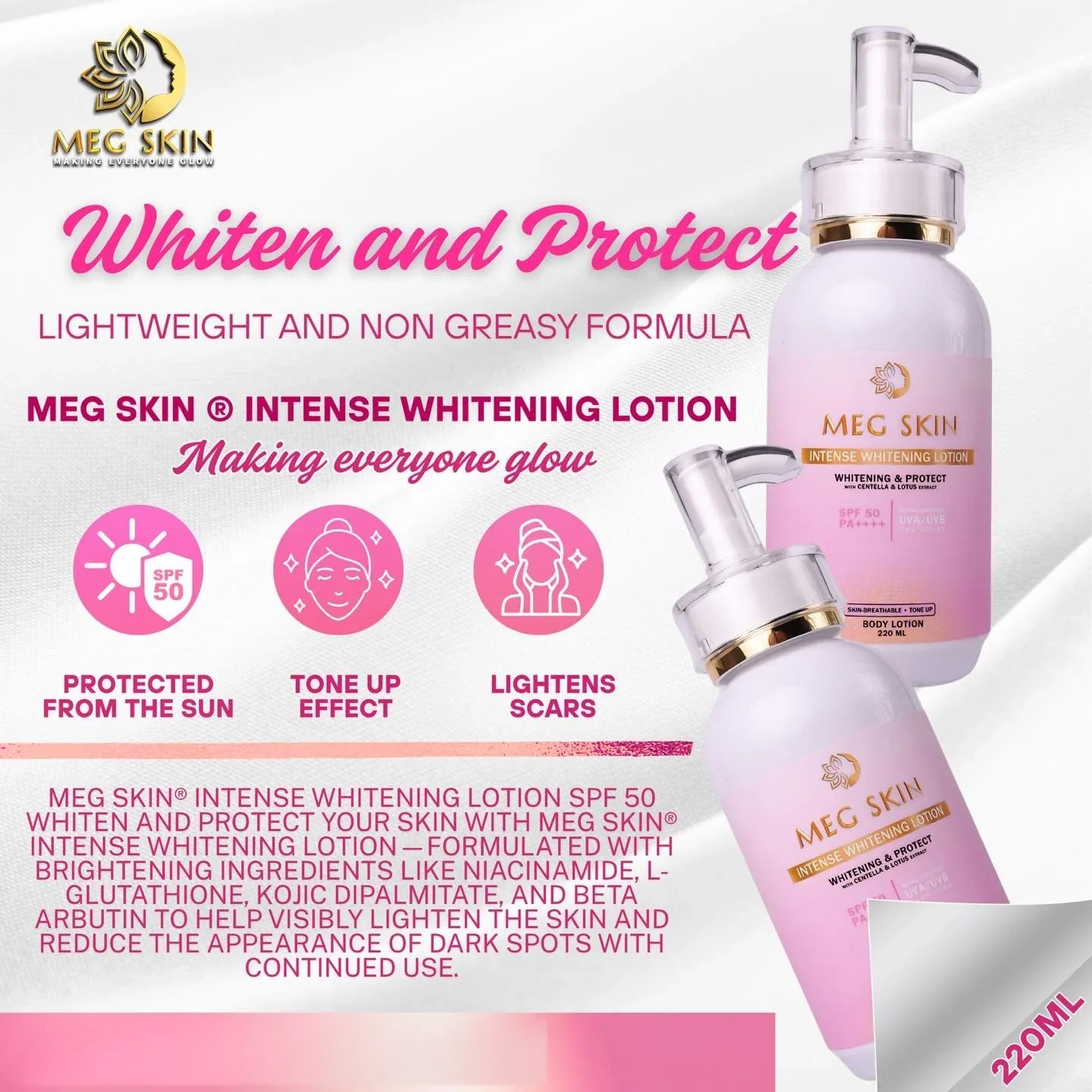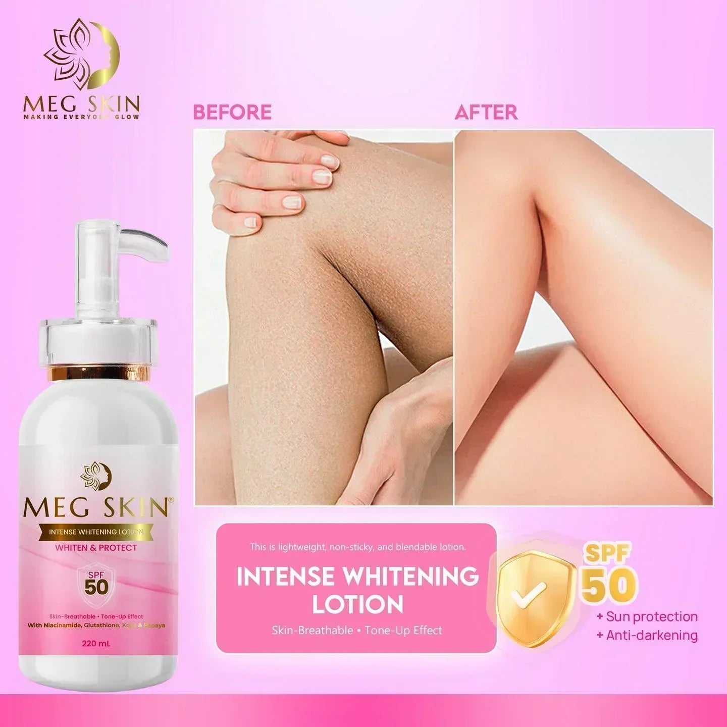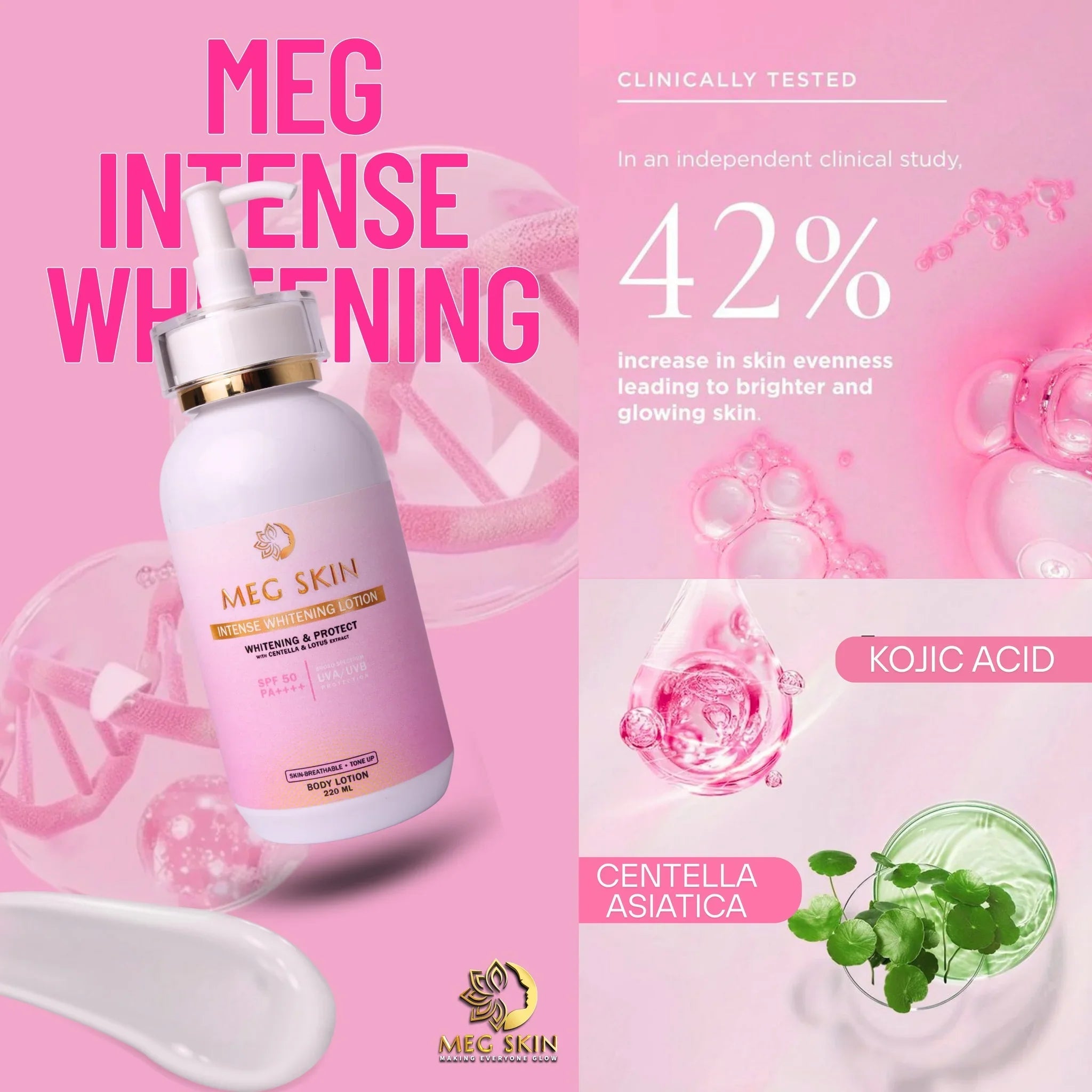 Enjoy a luminous, healthy glow with MEG SKIN Intense Brightening Lotion SPF 50 your all-in-one solution for skin brightening, hydration, and sun protection.