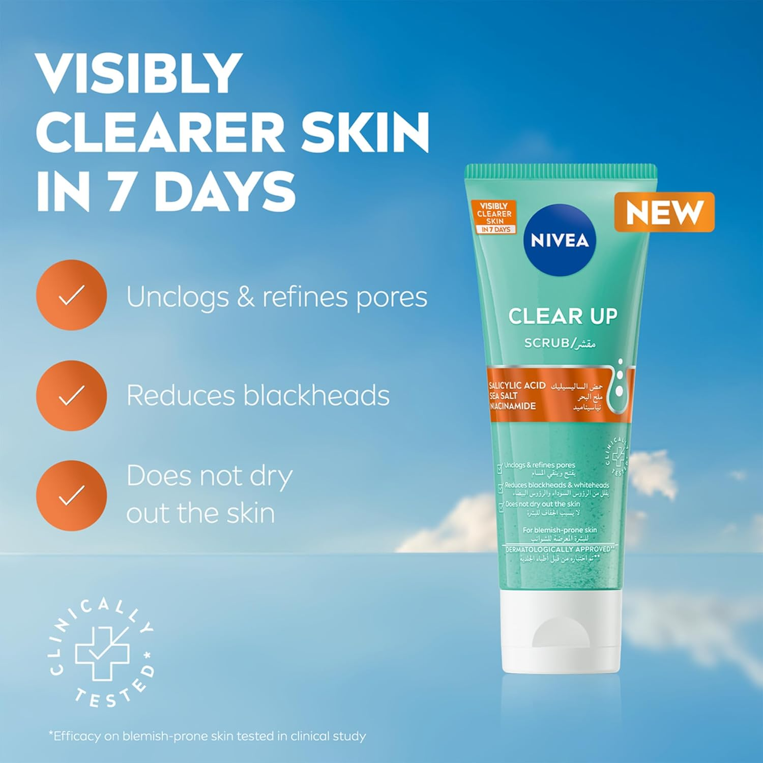Take back control of your skin with the NIVEA Clear Up Scrub, expertly formulated for blemish-prone complexions. Powered by Salicylic Acid, Sea Salt, and Niacinamide, this purifying scrub works deep within the pores to reduce blackheads, whiteheads, and congestion — without stripping or drying out the skin. The result? Visibly clearer, smoother skin in just 7 days.