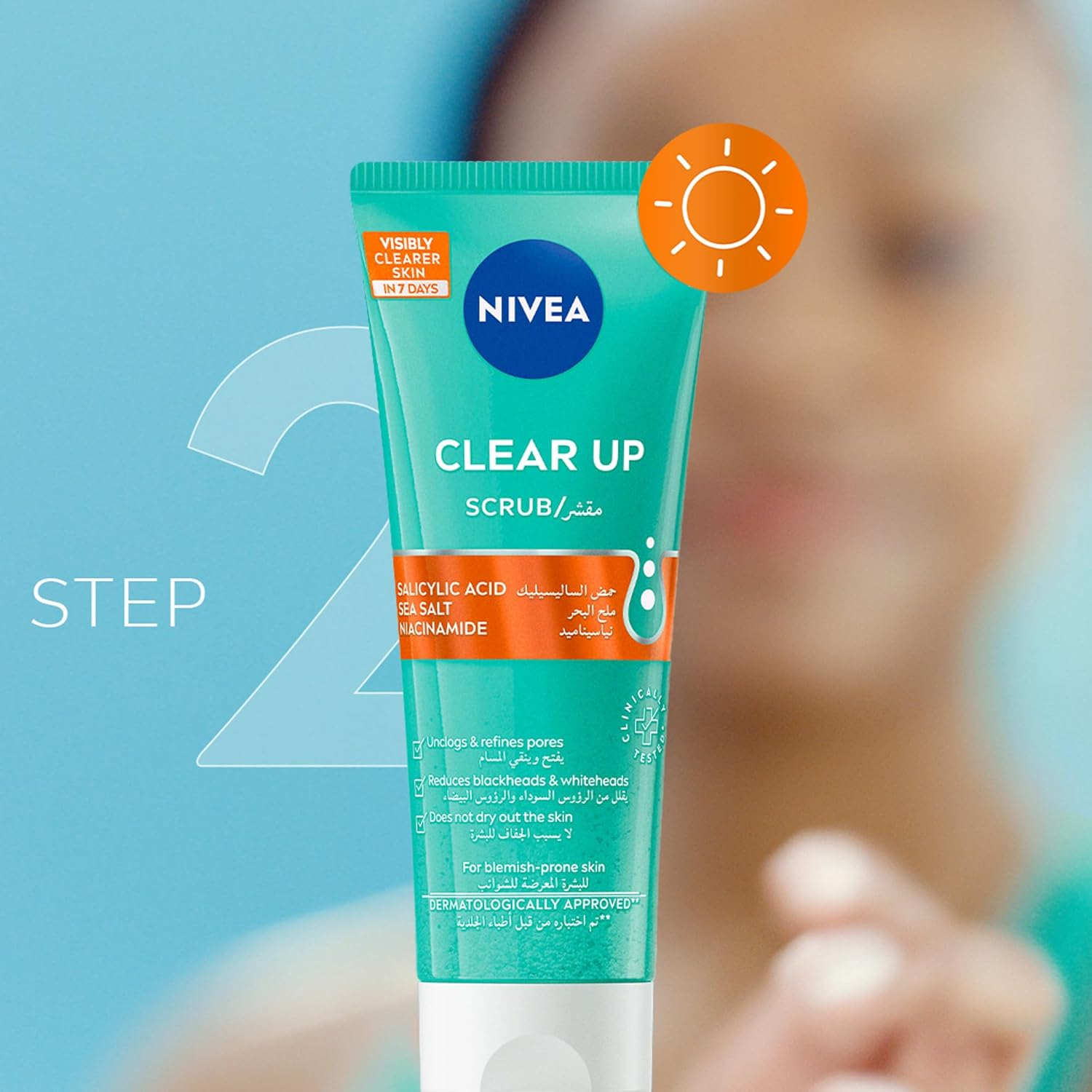 Want to gain back control over your skin? The NIVEA Clear Up Scrub is specifically designed for blemish-prone skin concerns. Enriched with Salicylic Acid, Sea Salt, and Niacinamide, it penetrates deep to unclog and refine pores while helping reduce blackheads and whiteheads — all without drying out the skin.