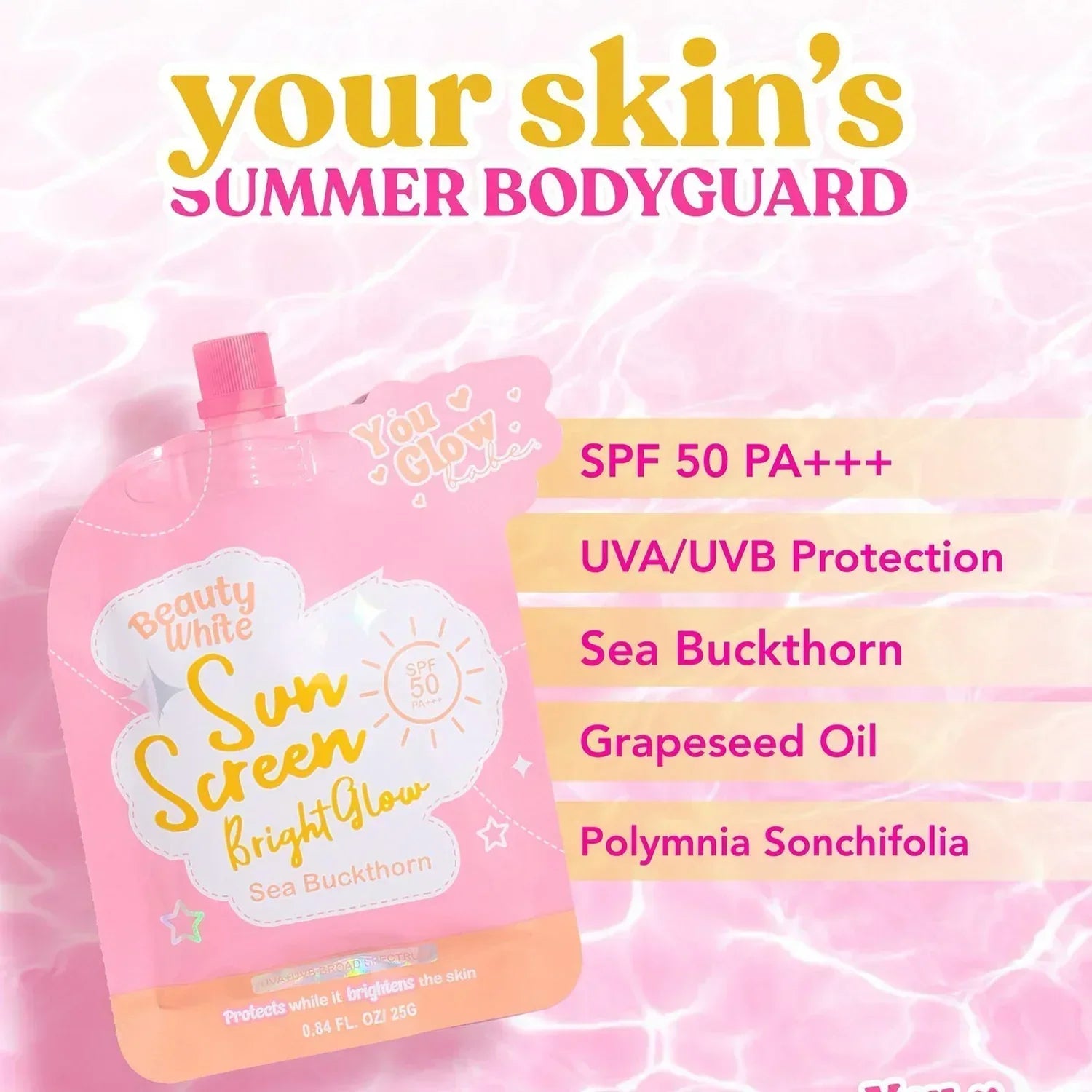 You Glow Babe Beauty White Sunscreen Bright Glow. With SPF 50 PA+++, this broad-spectrum sunscreen is packed with skin-loving ingredients like Sea Buckthorn and Grapeseed Oil to protect, nourish, and illuminate your skin all day long.